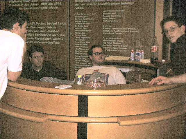 Man konnte umsonst einige Dosen Flying Horse trinken. Jemand von SUSE hat die installation von Q3A unter Linux vorgeführt. RBS, ein lokaler Funklanprovider hat was zu Funklanverbindungen in Dachau erzählt. Es gab einige Hardwaresponsoren fürs Netzwerk und für Grafikkarten und eine Softwarefirma, welche einige Games verteilt hat.